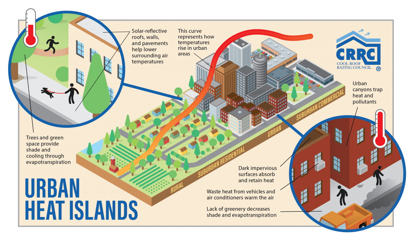 Concrete structures such as buildings, roads, and other infrastructure also absorb and re-emit the sun's heat more than natural landscapes such as forests and water bodies. Urban areas, where these structures are highly concentrated and greenery is limited, become “islands” of higher temperatures relative to outlying areas. The effect has earned its own name, urban heat island.